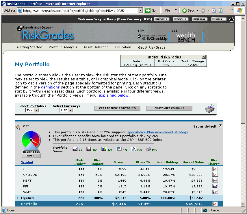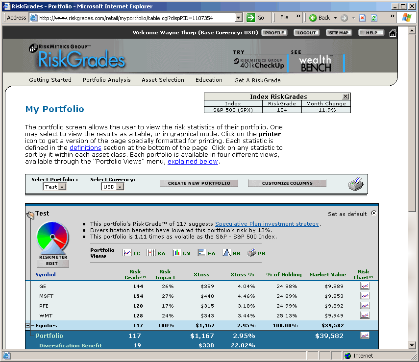 While risk plays an important role in investing, investors often lack the tools to assess the riskiness of their investments or their overall portfolio. With the RiskGrades Web site, users can gain an understanding of the risk of an individual asset and compare that risk to other assetseven if they are in different asset classes. The site allows you to assess the risk profile of a portfolio, analyze the impact of individual assets on overall portfolio risk, and run analyses to see how altering the asset mix will impact portfolio risk.