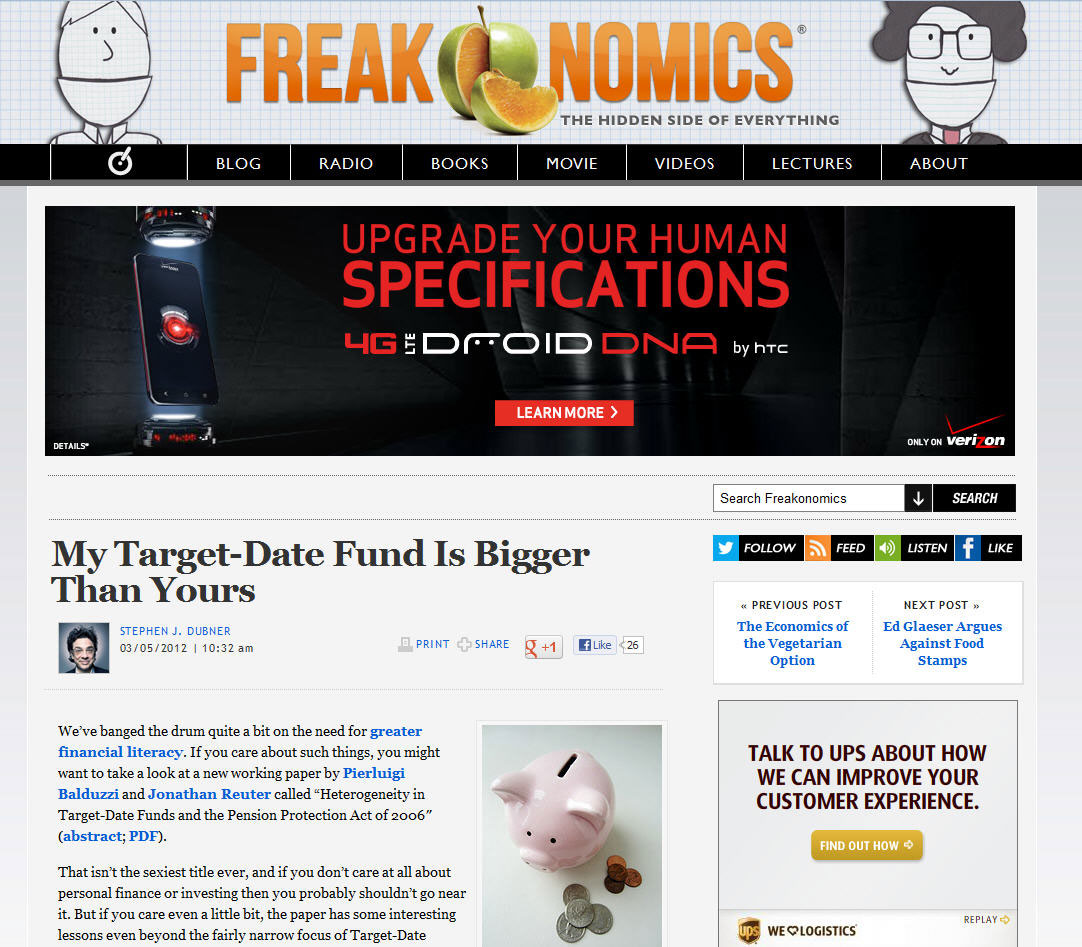 Although Freakonomics covers many timely topics, it doesn’t act as a news site, so it doesn’t continually update the blog with up-to-the-minute financial or political news as some other financial blogs do. It does, however, feature recent studies on a continual basis. For example, the latest post is about a new paper in the American Economic Review on how Americans are inconsistent when considering financial risk in choosing health insurance and 401(k) plans.