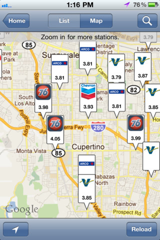 You can also choose a map view of the stations in your area, with thumbnails of the price of the selected grade or type of gas at each station. Tapping on a thumbnail will bring up the detailed information page for that station.