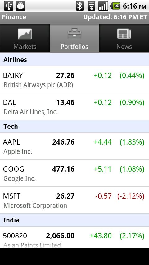 For those of you who have set up portfolios at the Google Finance website, you can sync so that you can track them from your Android device. This feature was disappointing in that the app only tracks the daily performance of each individual ticker in your portfolio, unlike the web-based version, which provides overall portfolio value and performance. You can add tickers to a portfolio with the app, but you are not able to specify purchase price or number of shares.