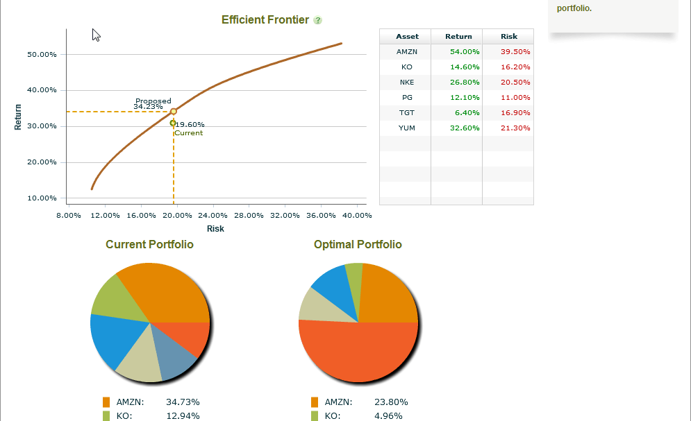Select a portfolio and click “Portfolio Optimization” to navigate to Kalengo.com’s optimization tool. This page lists your holdings and their expected return and average risk. Using these numbers and the site-generated Efficient Frontier, Kalengo.com suggests an optimal portfolio (one that maximizes expected return for a given level of risk) using your current holdings, and compares it to your current portfolio. The program shows you which of your current holdings to increase and decrease to reach your optimal portfolio.