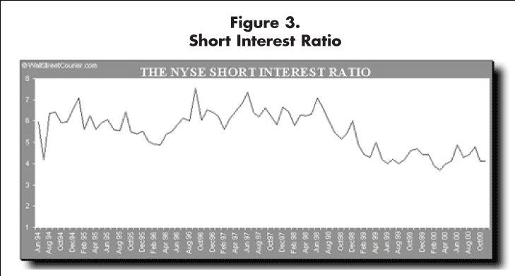 Short Interest Ratio: This is perhaps one of the most popular measures of market sentiment. Short interest is the number of shares that have been sold short and not yet repurchased. The short interest ratio takes the mid-month New York Stock Exchange short interest and divides it by the average daily trading value over the preceding four weeks. A short interest ratio of one means that the total outstanding short positions are equivalent to roughly one day’s trading volume (Figure 3).