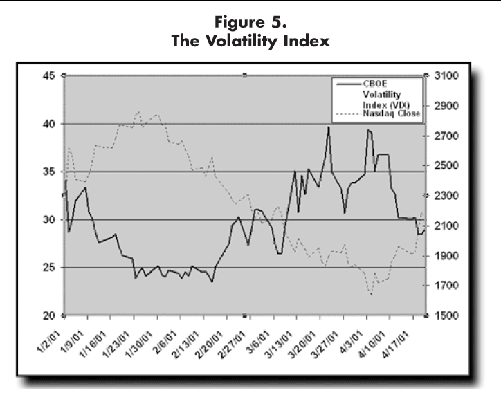 Volatility Index VIX: The VIX measures positive and negative sentiment as measured by S&P 100 index OEX options activity. A rising VIX indicates that negative sentiment is growing while rising optimism is marked by a falling VIX. Historically, the majority of put/call buyers are wrong—making the VIX another contrarian indicator. Therefore, a rising VIX is an indication that the market is becoming oversold, meaning a short-term bottom may be approaching. Likewise, when the VIX reaches low levels—the market is overbought—we can expect a possible short-term top to the market (Figure 5).