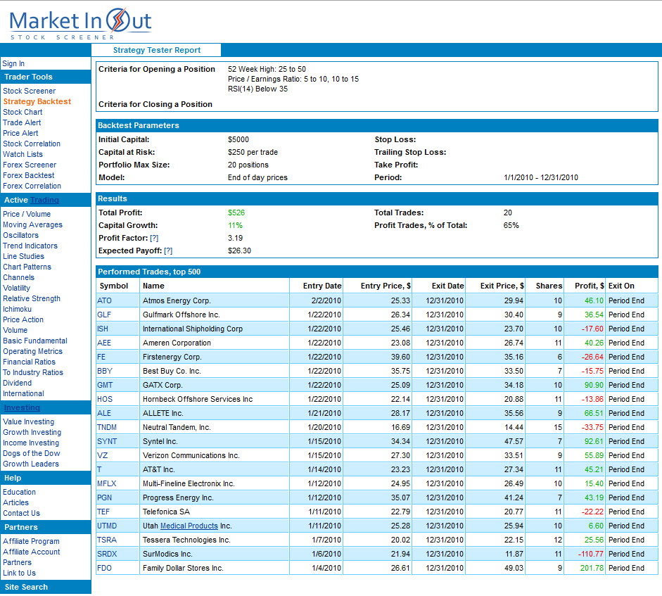 The Education section of the website is great for investors who would like to trade more, expand on their arsenal of analysis tools, or test the viability of various technical methods. This section is essentially an online version of “Technical Analysis from A to Z” by Steven Achelis (McGraw-Hill, 2000), which is a concise reference on a vast array of technical indicators and line studies for investors who are new to technical analysis. What makes the online version different from the book is that, for some of the indicators, MarketInOut provides direct links to screening criteria that uses the indicators. For instance, after reading about the MACD indicator, users can go to the bottom of the page and backtest any of the MACD screening criteria offered on the website to see how well it would have worked had it been applied in the past.