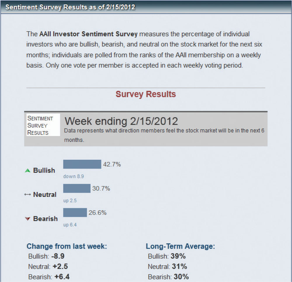 One sentiment indicator that is widely followed by professional traders and the financial press is AAII’s Investor Sentiment Survey. Each week, AAII members can vote online as to where they think the market is going over the next six months—up (bullish), down (bearish), or sideways (neutral). The results are published each Thursday at the AAII website (www.aaii.com/sentimentsurvey).