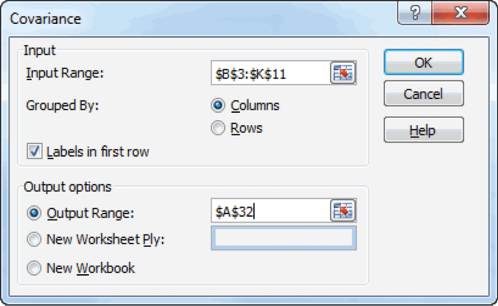 To create the covariance matrix for our 10 stocks, we click the Data Analysis button on the Data tab (in Excel 2007) and choose Covariance from the list. This launches the Covariance dialog box shown in Figure 2. We use the input range B3:K11 from Figure 1, grouped by columns, with the labels in the first row.