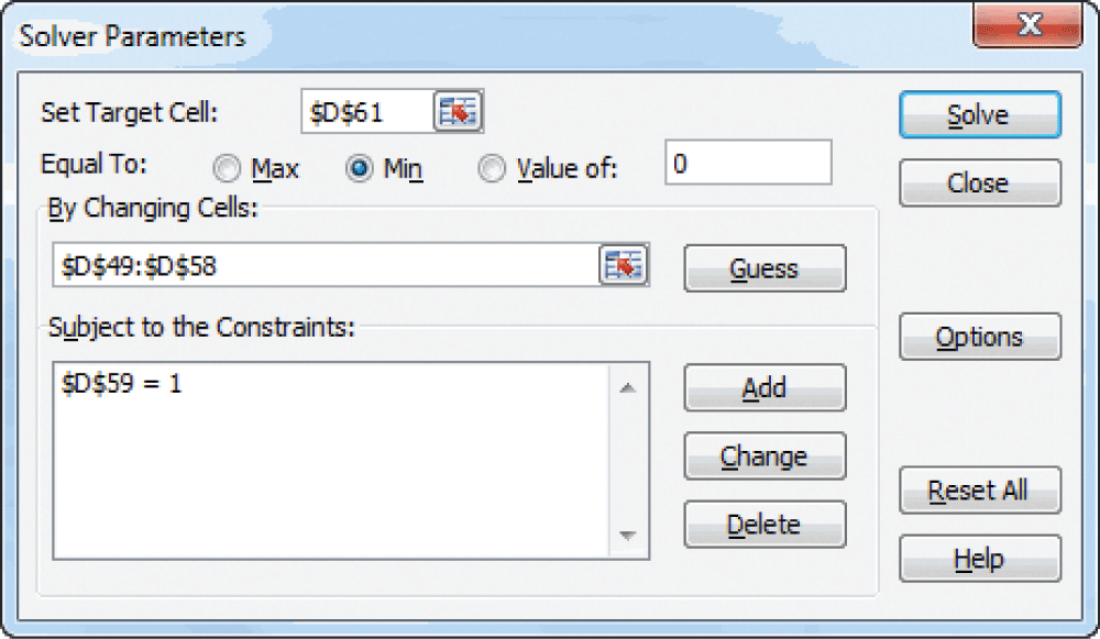 Next, we select the Min radio button to the right of Equal To: in the Solver Parameters box so that the Solver will minimize the function in the Target Cell (in this case, the standard deviation of our minimum variance portfolio). The Solver derives the minimum variance portfolio in our Target Cell $D$61 by adjusting the weightings of the 10 stocks (D49:D58). Therefore, the By Changing Cells in the Solver Parameters box will be the range $D$49:$D$58, which are the weightings for our 10 stocks. Lastly, we need to add a constraint to our function: Specifically, that the sum of the weightings invested in the 10 stocks will equal 1.0 (100%). Therefore, we click the Add button in the Solver Parameters box and add the constraint $D$59=1 and then click OK. Our Solver parameters should look like they do in Figure 5, at which point we can click on the Solve button.