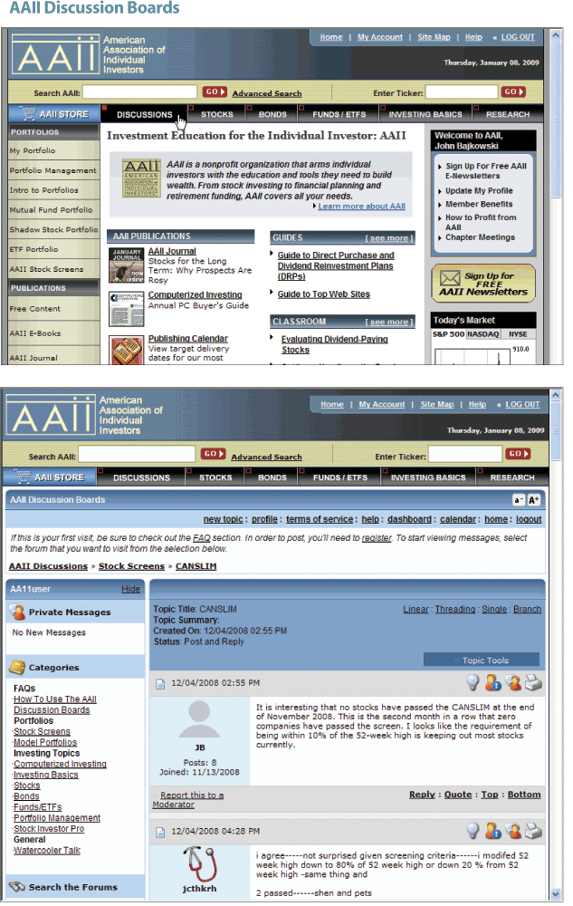 The Discussion Boards are broken down by topic, and then are grouped by more narrow subtopics. The Portfolios group includes discussion forums for AAII’s Stock Screens and Model Portfolios. The Investing Topics group includes the subtopics Computerized Investing, investing basics, stocks, bonds, funds/ETFs, portfolio management, and AAII’s Stock Investor Pro software program. Finally, the General topic group is for “Watercooler Talk,” which includes all hot topics outside of investing.