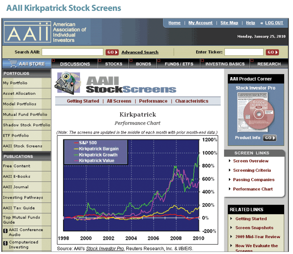 AAII maintains a library of 60 stock screens that are tracked on an ongoing basis. We have recently added three new screens to the AAII.com online database: Kirkpatrick Growth, Value and Bargain screens.