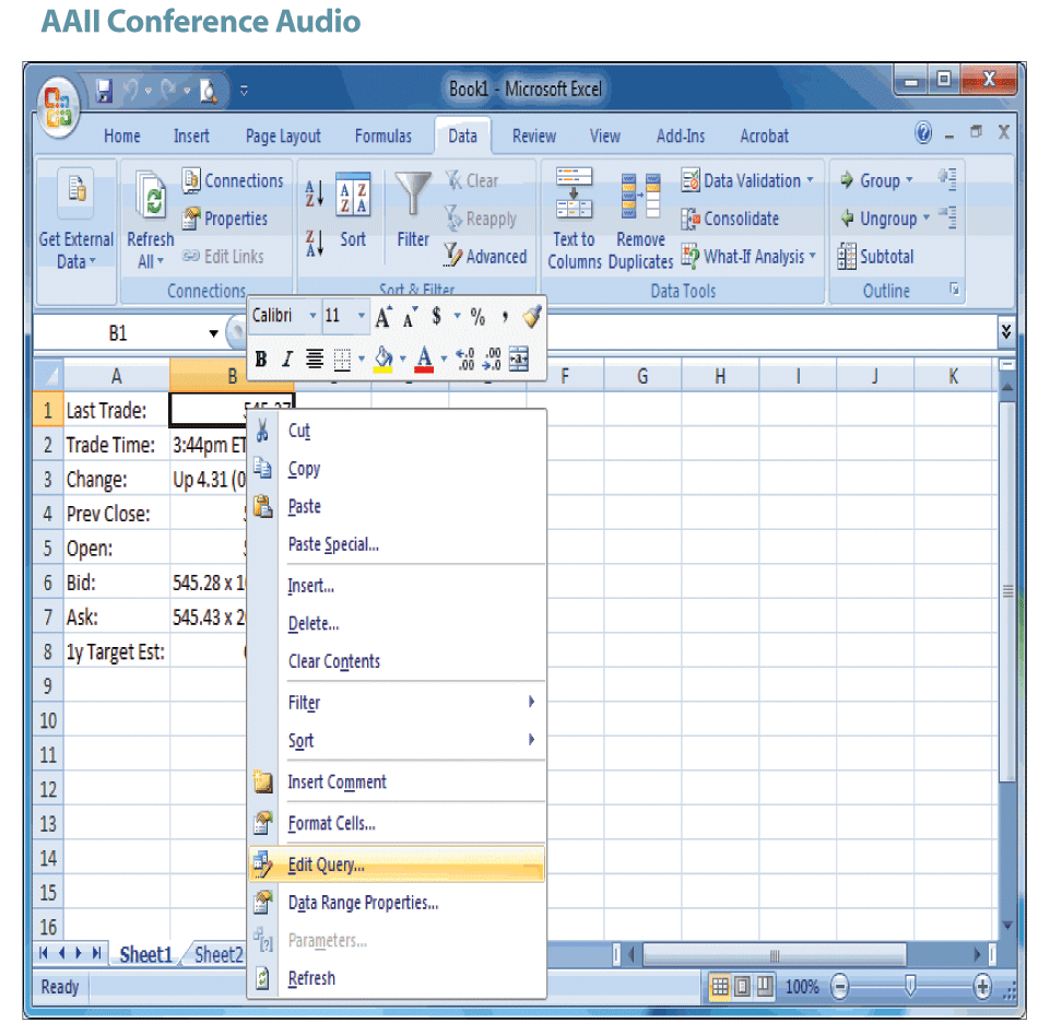 To order the audio recordings, go to: www.aaii.com/conferenceaudio. Subscribers can play the audio at the Web page or download the files to a computer. To download the files, right-click on “Download the Audio” and select “Save Target As” (or “Save Link As”). The audio clips are presented by day and labeled as speaker presentation or exhibitor workshop.