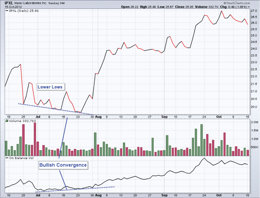 Figure 3 illustrates a bullish convergence for Impax Laboratories (IPXL) that took place between June and July 2012. During this time, IPXL shares moved below their late-June low, eventually bottoming out around $19.50. Beginning in early July, however, OBV was steadily rising. Once again, volume was leading price. IPXL shares broke out in late July and rose to $27 over the next couple of months.