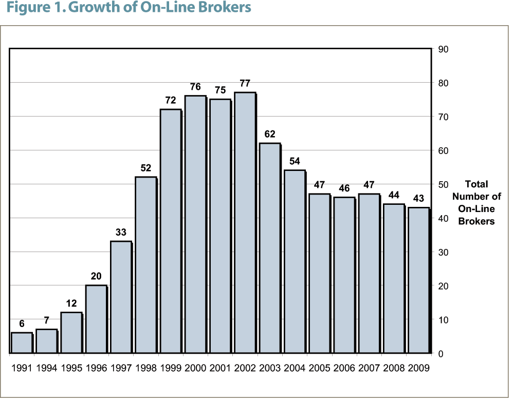 The bar chart in Figure 1 traces the growth and subsequent decline in the number of on-line discount brokerage firms over the last 17 years. A big jump took place in 1996, soon after the launch of the first Internet-based broker. The largest number of firms, 77, participated in the 2002 survey. That number has steadily declined due to industry consolidation.