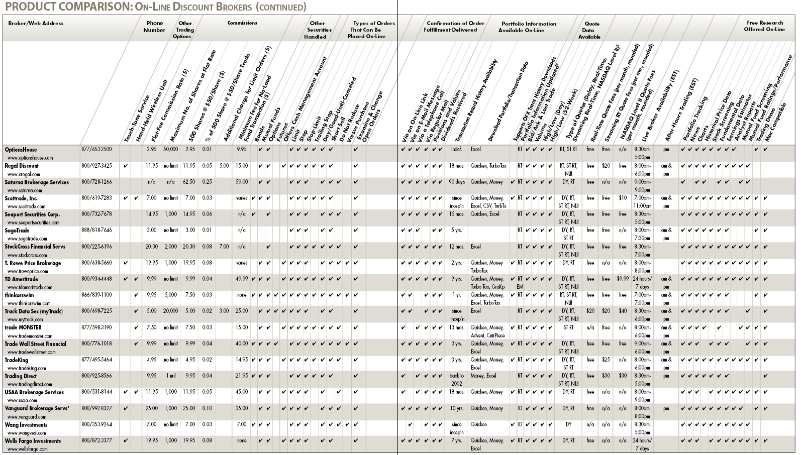 If you are in the process of reviewing several on-line discount brokers, the issues covered here help to create a good foundation on which to build. One area that all potential customers should consider—but that is hard to quantify in a comparison—is the type and quality of support received when problems or questions arise. Focus on the firm’s phone support and E-mail responses. Be sure to call prospective brokers and ask the representative questions, request literature detailing services and fees, E-mail the firm the same questions and be sure to check their Web site for general information. Compare the information received from each of these sources for consistency.