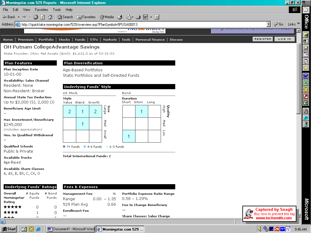The Personal Finance area of Morningstar provides specifics on each 529 plan, including plan features, total assets, fees and expenses, and maximum contributions. It also shows the investing style of the underlying mutual funds in the plan as well as the Morningstar ratings on the underlying funds.