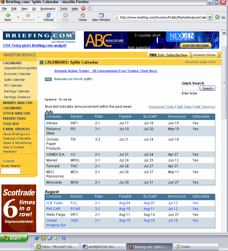 In addition to current new stories, charts, data and quotes for various securities, Yahoo! Finance offers pages dedicated to earnings announcements and stock splits. A list of links to various corporate events is found under the Todays Events heading in the Investing area. You can see a list of upcoming earnings releases, conference calls, economic data releases, initial public offerings, stock splits and upgrades and downgrades. Each list presents the data by day, week or month and offers links to more in-depth data on individual companies.