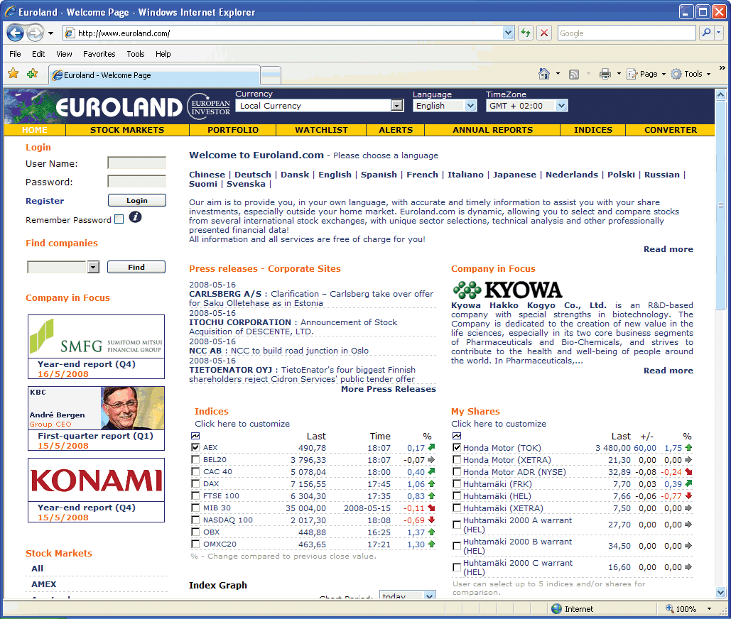 The Indices area includes performance data on popular indexes from a number of exchanges including Euronext, Amsterdam, NASDAQ, Helsinki, Milan, Tokyo, Toronto and more. Finally, a currency converter makes comparison among 33 currencies quick and easy. Currency exchange rates are updated throughout the day.