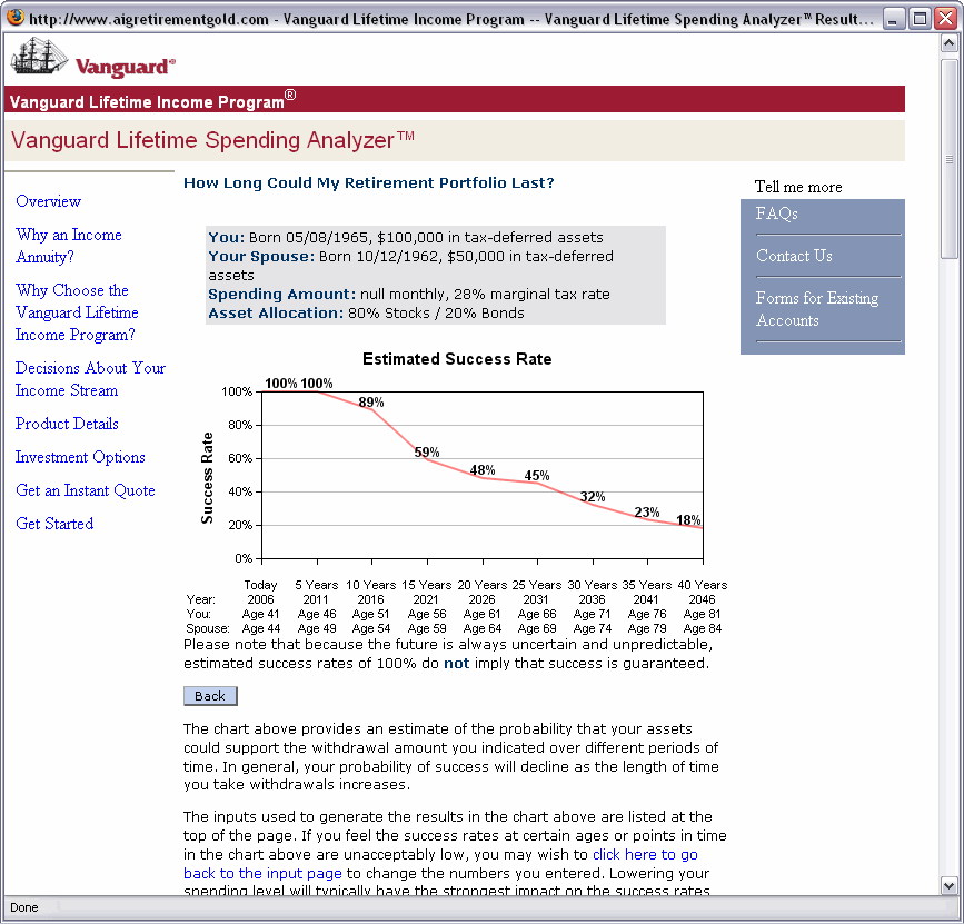 The site also offers a Lifetime Spending Analyzer tool that does a good job of helping you project spending. The tool uses a variety of simulated market scenarios (based on historical return relationships among various asset groups) to determine your tax-deferred portfolios ability to sustain an income stream over your retirement period. The tool factors in your portfolios size, your asset allocation, your withdrawal amount and the length of your retirement. A full explanation of all assumptions used in the calculations is provided. To find Vanguards Lifetime Spending Analyzer, go to the General Planning section of Planning & Education, then go to Other Planning Tools, then Retirement Planning and scroll down to Vanguard Lifetime Spending Analyzer.