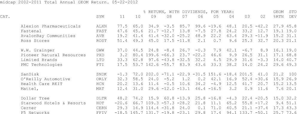 In our second backtest, we used the program to attempt to “optimize” a holding of a mutual fund—the Vanguard Mid-Cap Index (VMCIX). The results are equally impressive. We used the data supplied by Morningstar.com to find a sample of the fund. Morningstar.com provides the top 25 holdings for mutual funds. Out of these holdings, we used the stocks that have price data going back to 2002 as a representation of the entire fund—a total of 16 stocks.