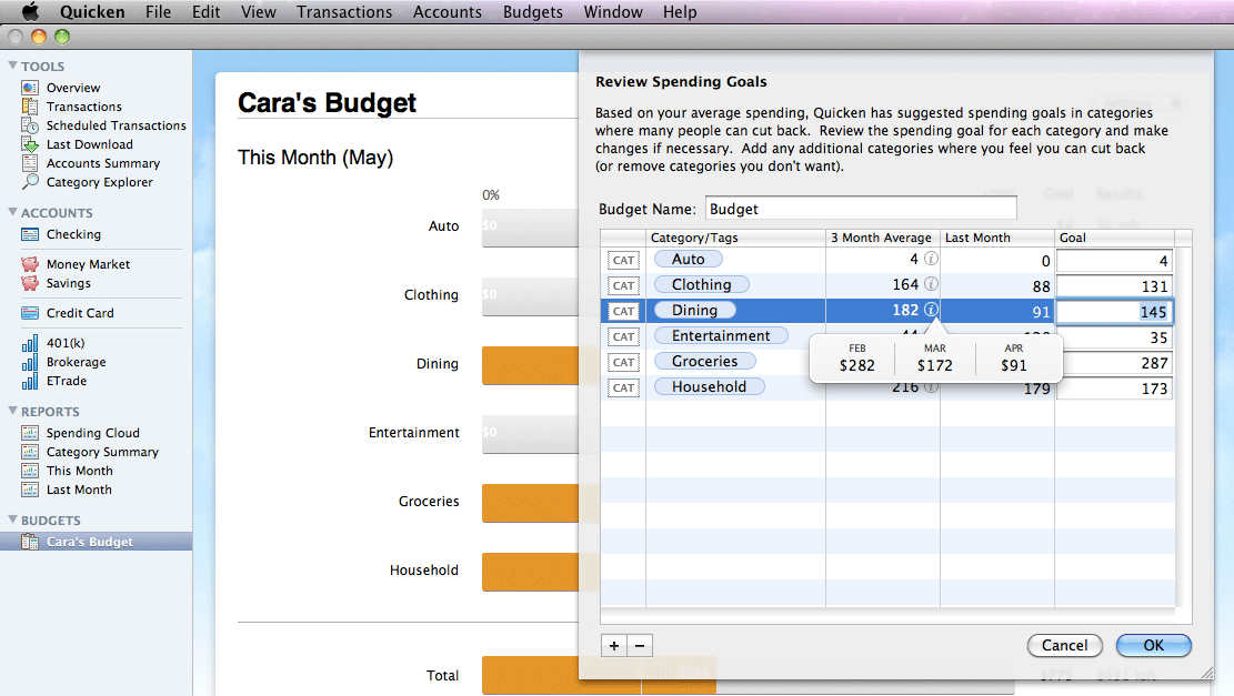 The final section contains the budgeting tools. Quicken offers quite a bit of flexibility in this area. The first step is to take a look at the automatically generated average spending table provided by Quicken. The table shows the categories in which you have spent money over the last three months. You can see the amount you spent last month as well as your three-month spending average for each category. By hovering your mouse over the i next to an average figure, you get a pop-up box with the individual breakdowns for each of the last three months (Figure 3).