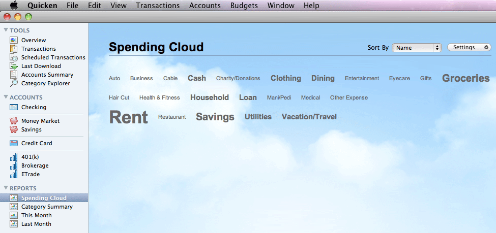 Quicken offers a few reports to give users a visual representation of their spending habits. The Spending Cloud report shows your budget categories in various type sizes: the larger the size, the larger the percentage of spending on that category (Figure 4). You can hover the mouse over the category name to bring up more detailed information. The Category Summary report provides a table listing the breakdown of spending by category. Finally, reports titled This Month and Last Month show all financial transactions for the specified time period.