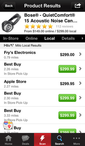 Recent updates to the app have also added “geofencing” capabilities, which allow the app to use your device’s GPS to identify local deals and offers. It can even identify “open box” inventory—products that have been previously opened and are being sold at a discount. RedLaser recently partnered with Best Buy, so when you open the app while in a Best Buy store, you are shown current Best Buy deals. Then, when you scan an item, you can choose the option of buying it in the store or online while also checking the fulfillment options—store pickup or shipping. Currently, RedLaser only supports Best Buy locations, placing it at a disadvantage to other apps such as Shopkick, which has partnered with Target, Best Buy, Macy’s, Crate & Barrel and more. However, the app does allow you to search and shop online at Best Buy, Toys ‘R’ Us and GNC.