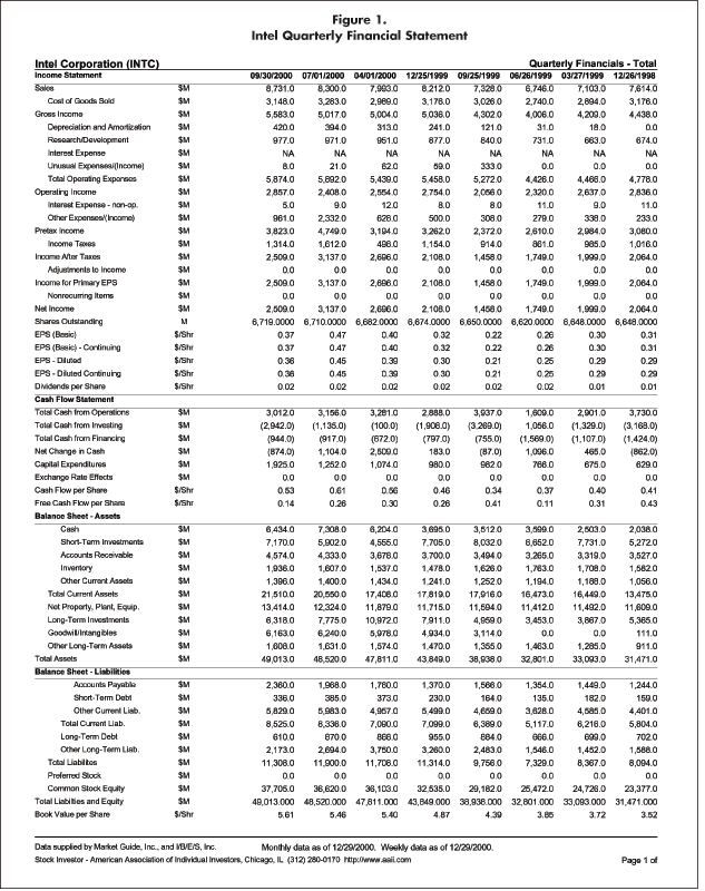 Figure 1 is the quarterly financial statement printout for Intel Corp from AAII’s stock database and screening program Stock Investor Pro. The income statement and balance sheet data from the figure was used to construct the dual cash flow calculation in Table 1.