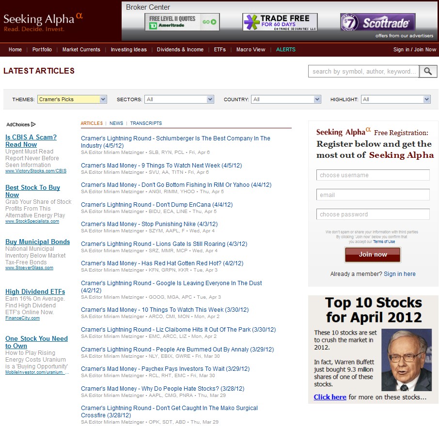 The Latest Articles page can be found at http://seekingalpha.com/articles or by clicking More Latest Articles at the bottom of the Latest Articles feed on the home page. There, users can filter articles by Themes, Sectors, Country, and Highlight. Fans of Jim Cramer’s show Mad Money can access Cramer’s Picks by going to the Themes dropdown, then to Long & Short Ideas, and selecting Cramer’s Picks.