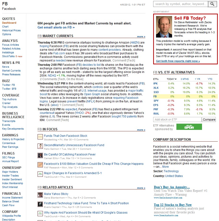 Users can also search for articles, analysis and data for a company by entering its ticker symbol into the search box. For instance, if a user notices that Facebook is currently a hot topic among technology IPOs, he or she could type FB into the search bar. The result is more information on Facebook than one would think possible, especially since Facebook is not yet trading. Users can find FB market currents, FB related articles, the company description, FB vs. ETF alternatives, charts, historical prices, SEC filings, ownership, and more.