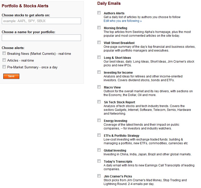 Seeking Alpha also has a useful Alerts function, which can be found on the main toolbar. This feature allows users to create portfolios or choose stocks and have related breaking news, articles, or a pre-market summary related to that portfolio or stock emailed to them. Users can also select from a long list of Daily Emails. One such email is Authors Alerts, which will send a daily list of articles by authors that the user follows.