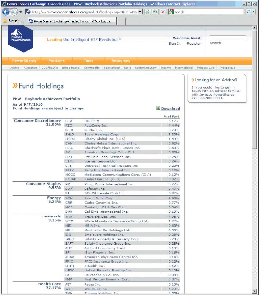 To view the current holdings of the PowerShares Buyback Achievers ETF, go to the PowerShares website and type the ticker symbol PKW into the search box. Next to Links, click on Fund holdings to see a complete list of the stocks in the ETF. The list can be downloaded into a spreadsheet.