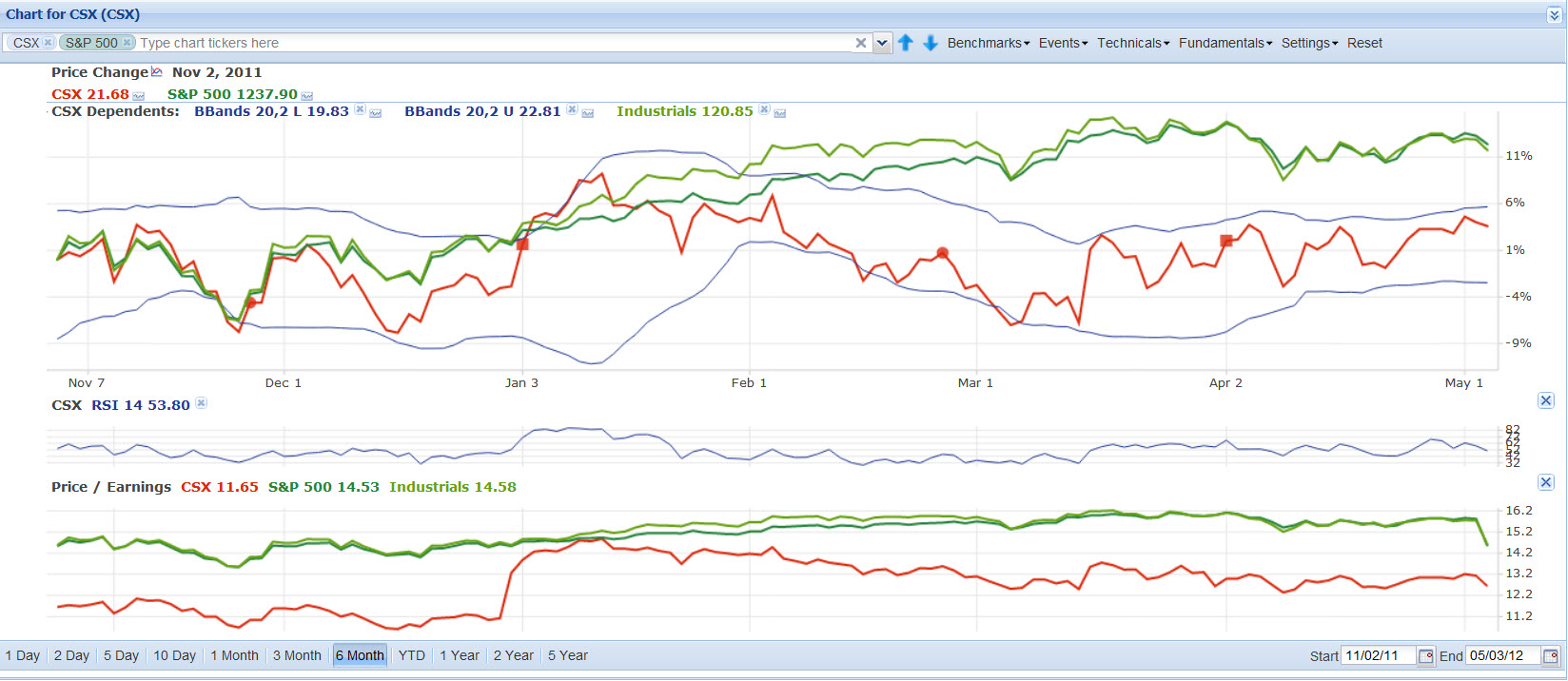 The Chart window allows users to compare a company’s chart to a benchmark, such as a major index, the industry, or even a portfolio. Available charts include price (dollar, percent and logarithmic) and candlestick. Users can even add events, such as dividends and earnings; technicals, such as Bollinger bands and RSI; and fundamentals, such as P/E and debt/equity ratios.