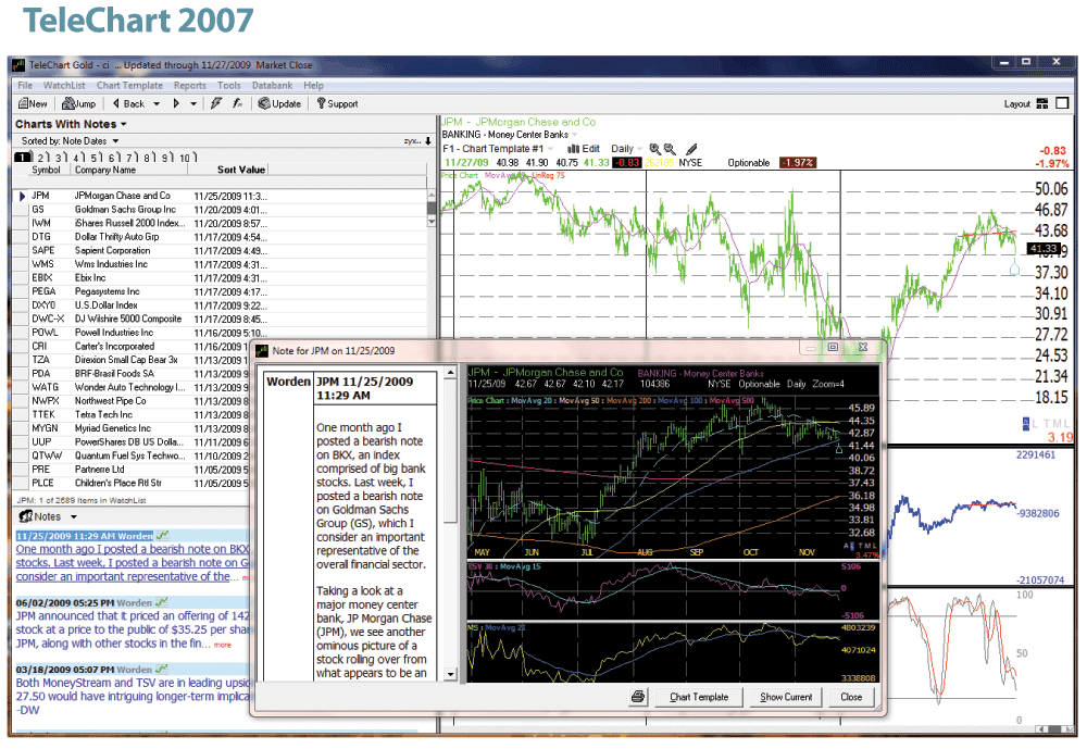 One of the most interesting and useful features of the software is the Worden Notes, based upon the trading ideas of the Worden brothers—Don and Peter. Users can view the Wordens’ charts to use and to learn from their indicator choices and analysis ideas. The notes are delivered throughout the trading day, as well as at the end of the day.
