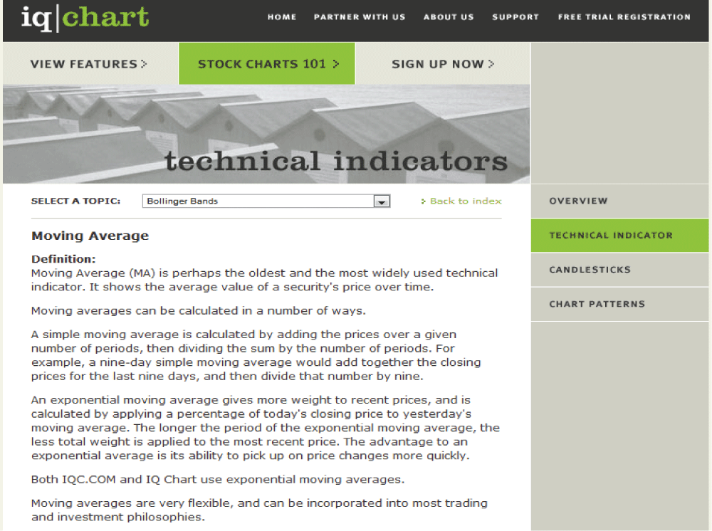 IQ Chart is a provider of stock charting software to individual investors and technical analysts. IQ Chart’s website provides an expansive section on technical indicators. In order to navigate to this section from the home page, click on Stock Charts 101 and then on Technical Indicators.
