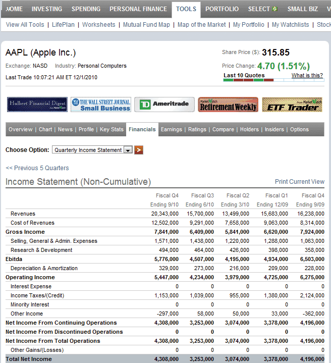 Much like Morningstar.com, SmartMoney.com provides relevant fundamental data on over 10,000 stocks. Simply enter a ticker into the main page, and you will be taken to an overview page that includes current data such as price, volume, price-earnings ratio and yield, as well as news, earnings and key stats. Detail pages provide more in-depth information, including a company profile, financial statement data, earnings forecasts and analyst recommendations, insider trades, and funds and ETFs that hold the stock. Most of these pages include compare tools that allow you to see the statistics side by side with those of other stocks. A distinctive feature of the overview page is the “last 10 quotes” bar. This shows the last 10 quotes received and allows the user to see whether the stock had an upward or downward price change. Quotes for heavily traded securities are shown in real time, so for a stock such as Apple, the “last 10 quotes” bar updates more than once a second.