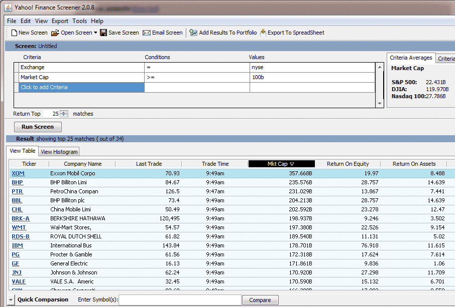 Yahoo! Finance offers two screeners for free: a basic HTML version and an advanced Java version. The basic HTML screener allows you to manipulate 16 data points by choosing the minimum and maximum values and includes categories such as industry, valuation and analyst estimates. The advanced screener requires the Windows operating system along with Java version 1.4.1. There are over 150 screening criteria from which to choose. Yahoo! Finance provides averages and definitions for the criteria, making it simple to choose relevant numbers. A table showing key fundamental data is available, along with a histogram allowing you to see a graphical representation of the resulting companies grouped by market capitalization, return on equity, return on assets, forward price-earnings ratio or beta. You may save, e-mail and export your results.