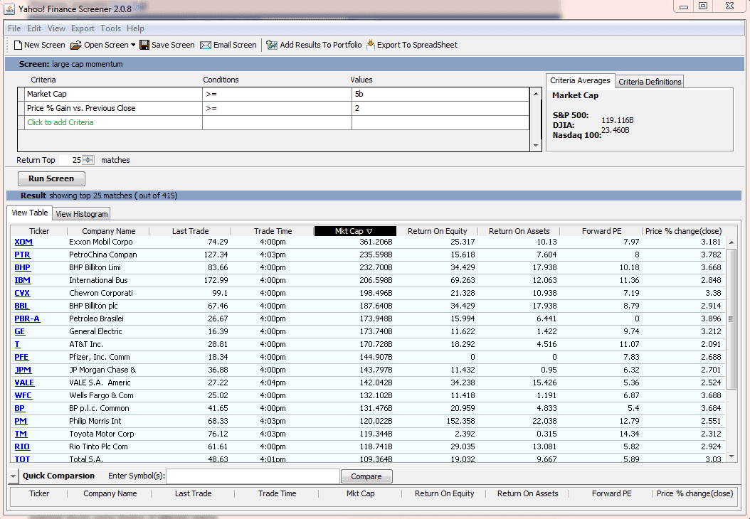 The stock screener offered by CNBC.com boasts over 80 data fields with a universe of almost 12,000 companies. There are five predefined screens that look for steady earnings, dividends, large-cap growth, small-cap value and large-cap value. The mutual fund screener uses over 70 data fields and offers a universe of over 21,600 funds. Much like the stock screener, there are five predefined screens: high-net-asset stock funds, high-net-asset fixed-income funds, foreign equity performers, top-performing equity funds with low turnover, and steady performers.