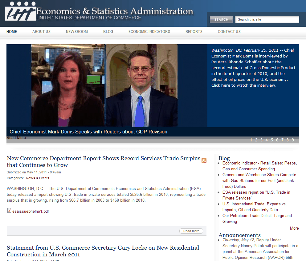 The Newsroom area of the website provides official statements and releases by the Economics and Statistics Administration. Most of these articles are included in PDF format as well. The Blog section of the website is maintained by Mark Doms, the chief economist of the U.S. Department of Commerce. Doms’ blog not only provides links to relevant economic data in the Newsroom, but it also offers his own input. The blog is updated regularly and provides valuable opinions from a well-respected member of the U.S. Department of Commerce.