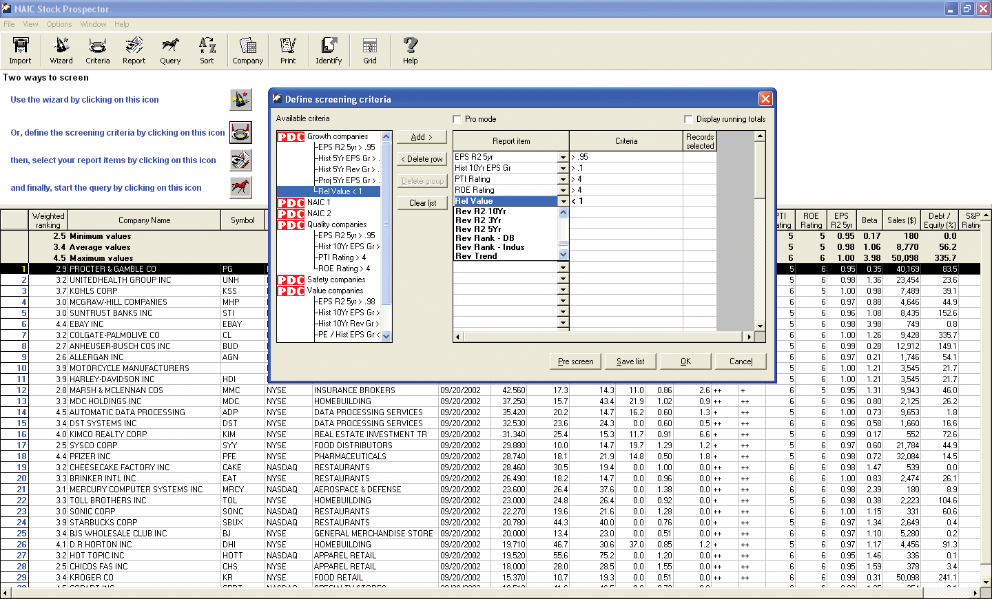 There are two ways to create screens: You can either use a wizard that walks you through the process step-by-step, or create an entire screen on your own. The wizard allows you to choose from seven predefined screens including one focused on Dow Jones industrial average stocks; screens looking for growth, quality, safety and value companies; as well as two proprietary screens.