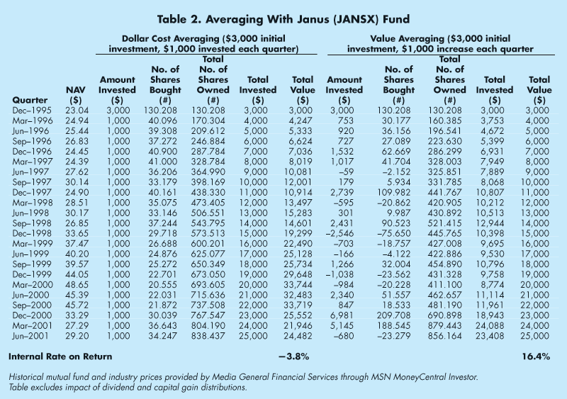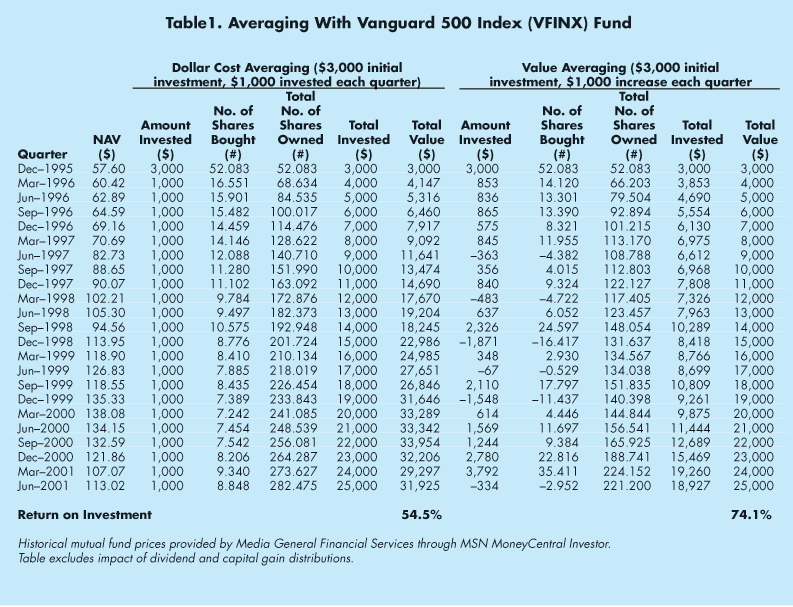 Tables 1 and 2 show examples of dollar cost averaging and its more market-tuned cousin, value averaging, illustrating the structure of each investment plan and highlighting the differences. The investments in the example are the Vanguard 500 Index mutual fund (Table 1), a broad-based large-cap stock index fund, and Janus (Table 2), a growth mutual fund; the time period covered is the last five?and?a?half calendar years, January 1996 through June 2001; the investment frequency is quarterly. These two averaging approaches could be used to invest in individual stocks as well.