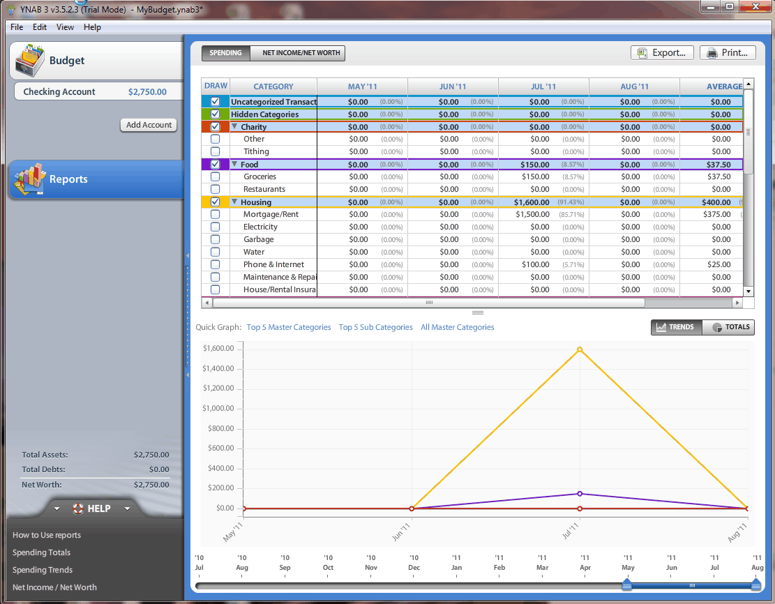 At any time you can pull up the reports section, which shows your monthly spending trends and totals. The program will categorize your spending and present the area from which most of your spending occurs. The line graphs offer an easy way of tracking any trends in spending, allowing you to quickly pinpoint areas where spending is increasing. The graphs can also be exported into an Excel file or printed.