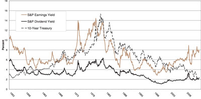 Since 1953, yields on the 10-year Treasury have averaged 6.21%. Earnings yields (earnings divided by price—the inverse of the price-earnings ratio) for the S&P 500 have averaged 6.84%. Proponents of earnings yield say the asset with the higher yield is the one that is more attractively valued. Historically, this has been stocks, but not by much. In fact, earnings yields have ranged between +2 and -2 percentage points of the benchmark bond’s yield 60% of the time. Based on today’s closing price, the earnings yield on the S&P 500 is 8.01%, or 6.43 percentage points higher than the yield on the 10-year bond.