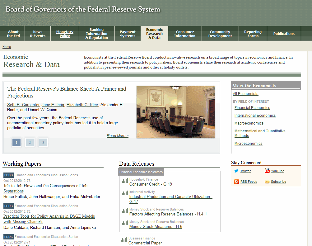 The Federal Reserve provides a compilation of speeches and testimony from Fed officials, both in written and video format. Policy statements and press releases for certain economic data are published, including the statement and minutes from the periodic Federal Open Market Committee meetings. The About the Fed section includes links to the websites of the 12 Federal Reserve district banks, each of which provides their own collections of data, articles and analyses.