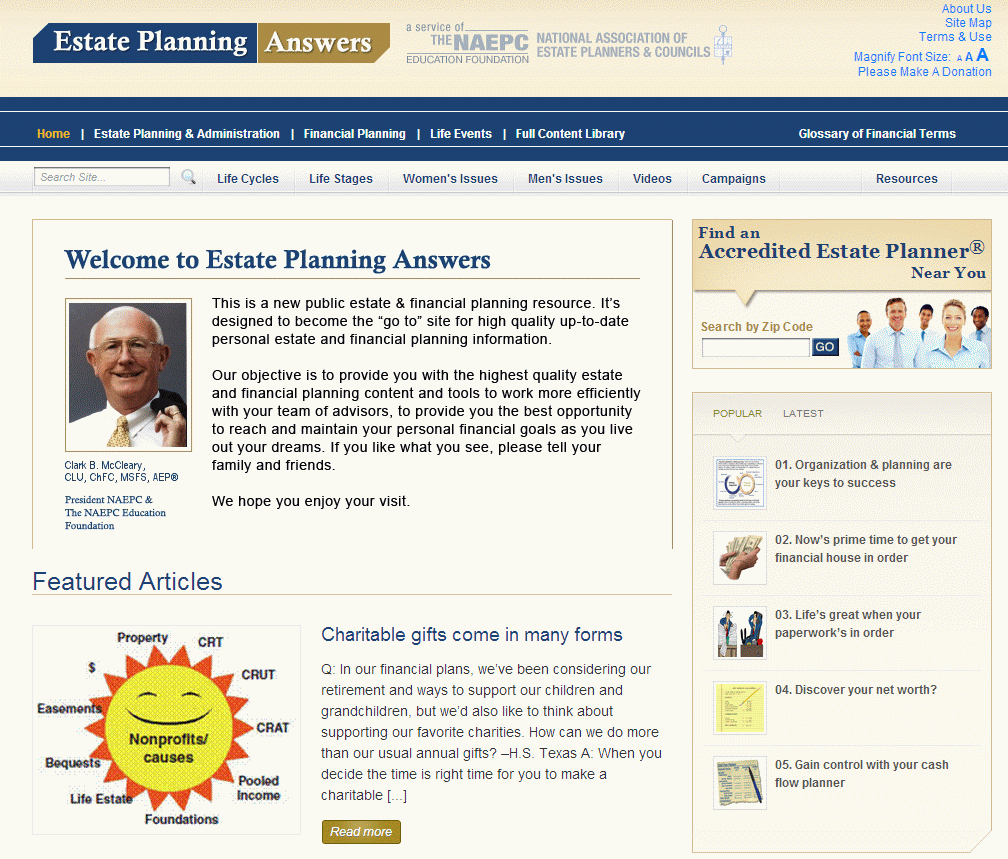 Operated by the National Association of Estate Planners & Councils, this site gives information on a wide range of estate-planning topics. Subjects range from long-term care planning to durable power of attorney to tax planning. The site also offers information on subjects not often covered, including spendthrift heirs and non-traditional families. Several articles direct readers to third-party websites for more information.