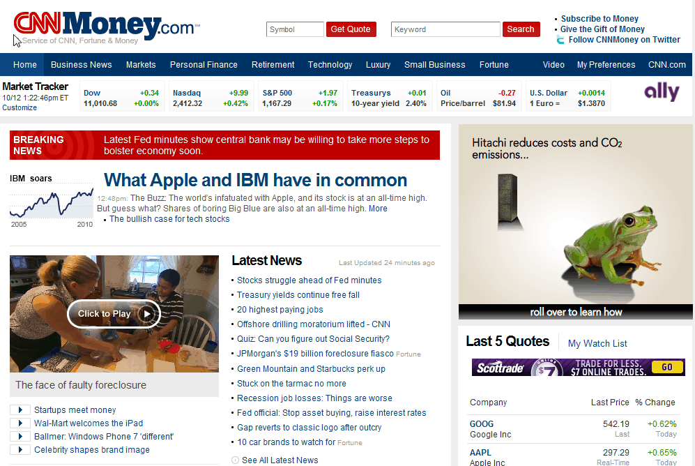 The Internet home of Fortune, Money and CNN offers current and archived magazine stories as well as daily CNN videos. Separate areas for business news, markets, economy and technology are provided. Data is given on stocks, U.S. and world markets, bonds, commodities, ADRs and currencies. A section is now provided for international business news. Registered users can create a profile and add alerts for companies, markets, mutual funds, ETFs and keywords. Site allows users to create a watchlist and offers RSS data feeds. Videos and podcasts are available. At the bottom of the page, popular articles from Fortune, Money, CNN and DailyFinance are linked.
