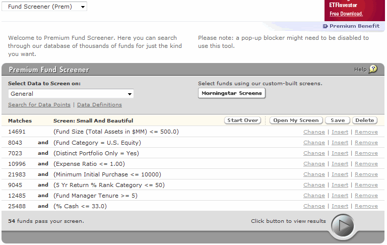 Premium Fund Screener includes data for almost 26,000 mutual funds. Screening criteria is broken down by category and a comprehensive definition dictionary is available. Provides data field quartile ranges to assist users in picking values. Offers 10 preloaded screens that help you get started. After entering your criteria, the screener will show how many funds meet your requirements, making it easy to tighten or loosen the standards if needed. Users can search for data points of interest. Screens can be saved for later use. For each screen, you are able to rank the passing companies according to your preference for each data point used in the screen. Free mutual fund screener is offered, but only has 18 data points; the criteria are not customizable and results cannot be saved.