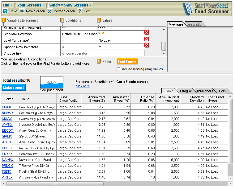 Over 23,000 mutual funds are available for screening on 50 separate criteria. Descriptions of the screening criteria include average values for the various mutual fund classes. After entering your selection criteria, the screener shows how many mutual funds pass, which makes tightening and loosening your requirements simple. The screener is easy to use and allows the user to save screens for future use. The application also comes with nine pre-loaded screens based on different investment styles. Allows users to construct a report for all passing mutual funds with customizable columns for data points. Provides capability to export the data listed in the report. Screener requires Java to be installed to work properly.