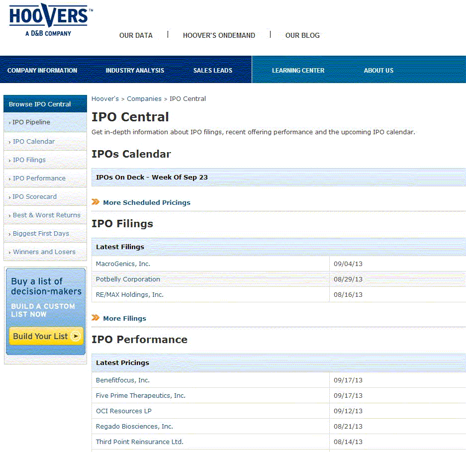 Lists the proposed IPO offerings for the week, latest IPO filings and latest pricing information. Each company name in the charts links to a quick overview of the firm. Hoover's also provides a calendar, and its IPO filings section organizes filings by quarter. The IPO performance page presents shares offered, offer amount and price, along with first day opening and closing prices. A "IPO scorecard" offers data on best and worst returns, biggest first days, and winners and losers; it also provides a breakdown of IPO pricing by industy for the last quarter.