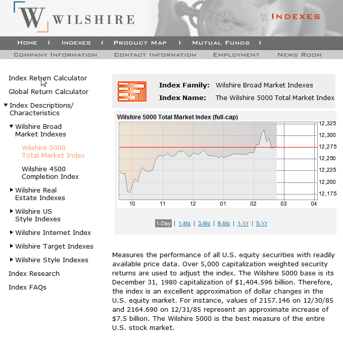 Wilshire provides broad market, real estate and U.S. style indexes. The site presents current and historical performance and construction/methodology information such as index membership requirements, weighting and adjustment and maintenance. Characteristics page shows index fundamental data, while membership page lists securties in each index. The Index Return Calculator allows users to track performances of a combination of indexes. Users are also able to input an "as of date" into the caluculator to obtain figures for various time frames.