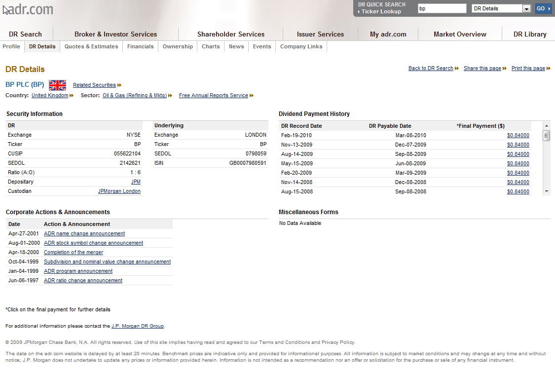 Offers extensive list of sponsored and unsponsored ADRs and holding company depositary receipts (HOLDRS). Search for ADRs by region, country, industry, DR exchange and depositary. Summary table lists issue, symbol, CUSIP, exchange, conversion ratio, country of origin, industry, depositary, sponsorship and date of last update. Links are provided for further research on individual listings. The site provides extensive DR educational resources housed in DR University, which provides both basic and in-depth education. A free interactive charting tool is available.