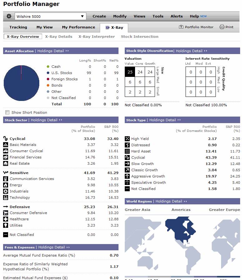 Morningstar allows you to import portfolios using Quicken, Excel and websites such as MSN Money and Yahoo! Finance. Tracks the current price, price change, shares held, market value, percentage weight and Morningstar rating in the summary page. Also provides news and opinions, gain/loss tables, fundamentals and insights. Four different views with 75 data points are available, along with a section that charts performance. The X-Ray function, a Premium feature, reports your portfolio's weaknesses in asset allocation, and the Stock Intersection Analyzer lists any stock overlap in your mutual funds. The Risk Analyzer evaluates how your securities interact and measures overall portfolio risk. A nightly email is tailored to your alert settings, such as changes in ratings, estimates and financials; news; actions such as splits and dividends; performance; and price movements. Portfolio views are printable. A comprehensive help section that includes data definitions is now available. A comprehensive report can be printed on your portfolio as a whole that incorporates several Premium features (only available to Premium subscribers).